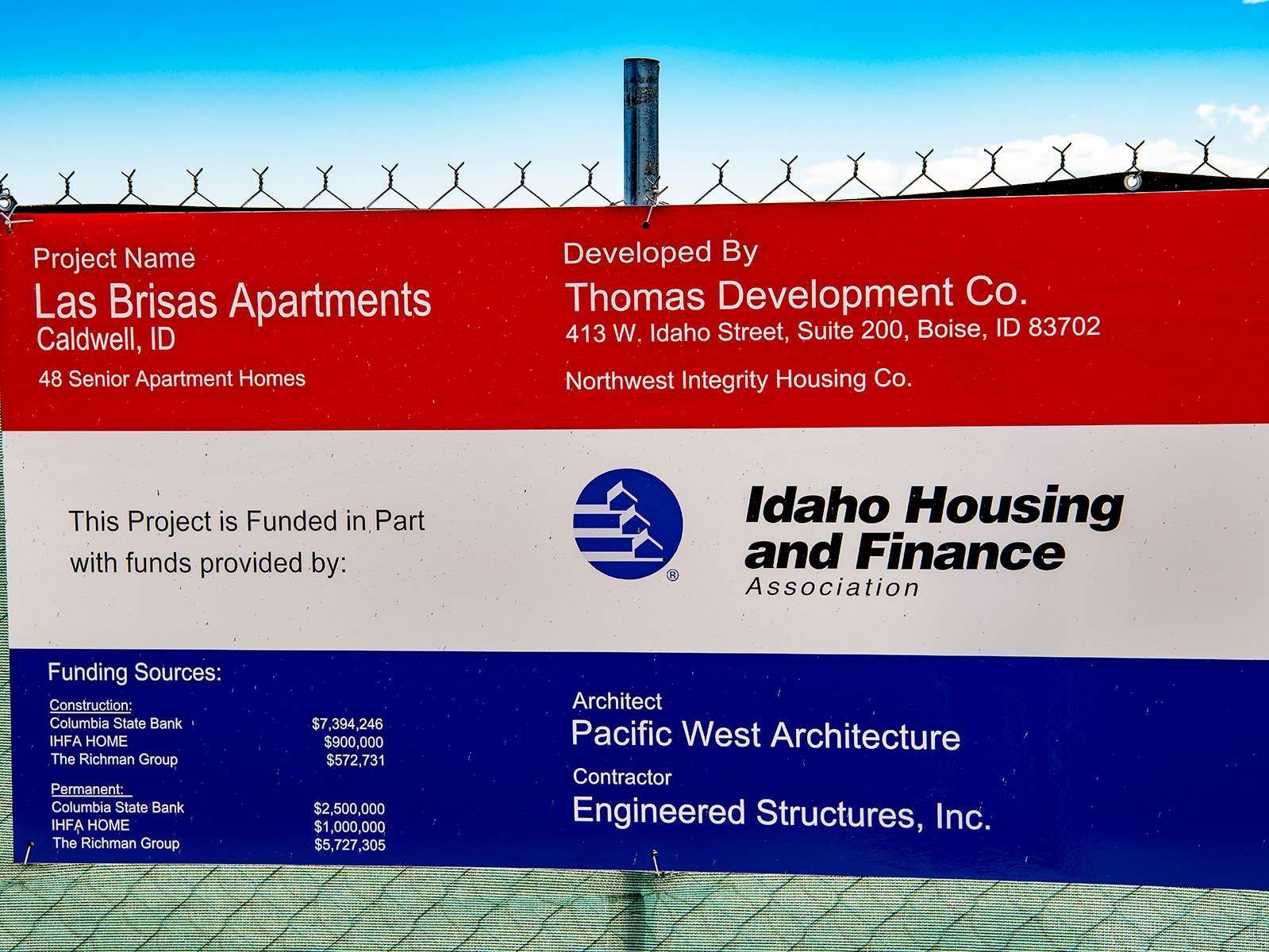 - April 30, 2019 - Construction has begun for Las Brisas Apartments at 1420 E Ustick Rd. in Caldwell, Idaho. The new construction will offer 48 apartment homes to serve the age 62 and older group.